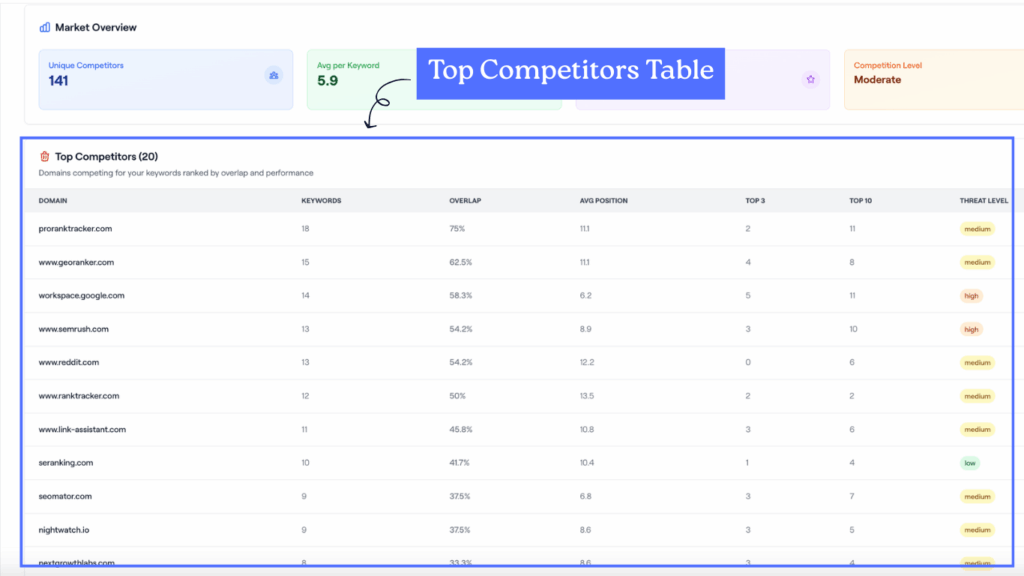 Just beneath the overview, you’ll find a table that highlights your Top Competitors along with their keywords, overlap percentage, average positions, and several other metrics that give you clarity about their local SEO presence.