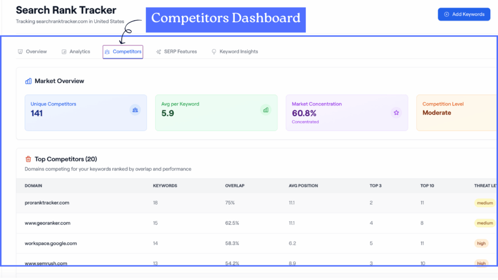 In this guide, we’ll walk through the competitors dashboard step by step and show you how to use it to improve your SEO strategy.